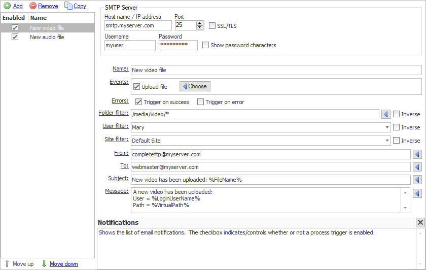 CompleteFTP supports highly customizable email notifications. This means that when an event such as a file upload occurs, an email can be sent.