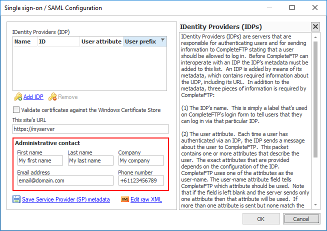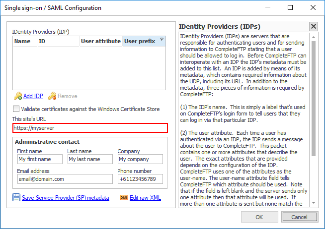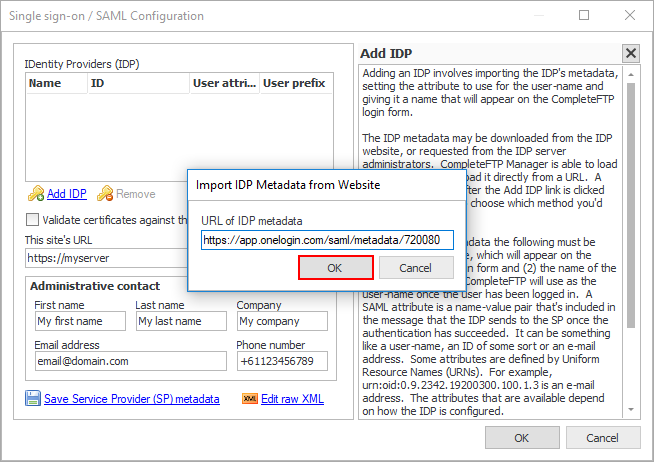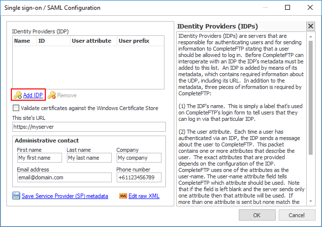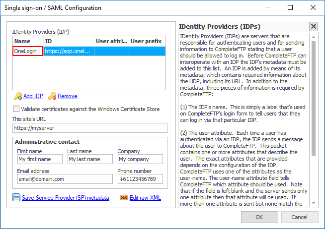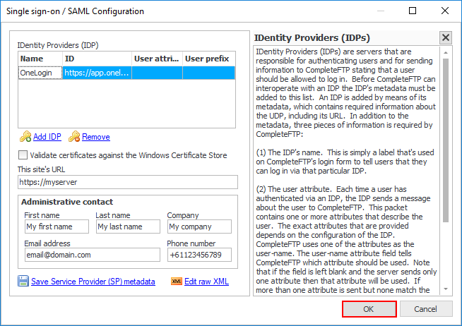 Now, register OneLogin as an IDP in CompleteFTP by clicking 'Add IDP' link.