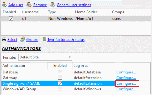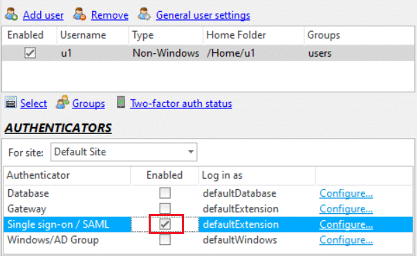 Enable the Single sign-on/SAML authenticator by checking its 'Enabled' checkbox.
