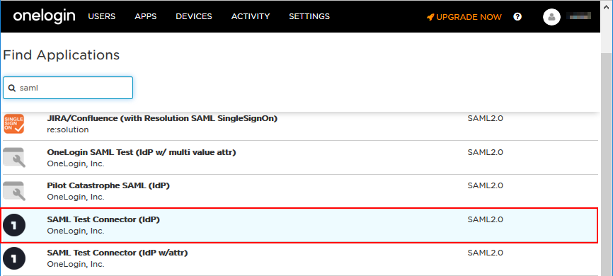 Enter 'saml' into the search box, then pick 'SAML Test Connector (IdP)' from the list.