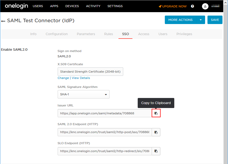 Next, go to the SSO tab, copy the Issuer URL to the clipboard for later use. This is the URL that the IDP's metadata file can be downloaded from.