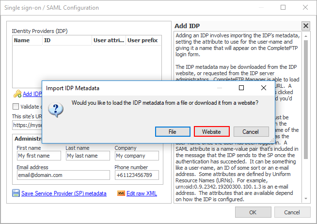 That brings up the 'Import IDP Metadata' dialog. Choose the 'Website' button.